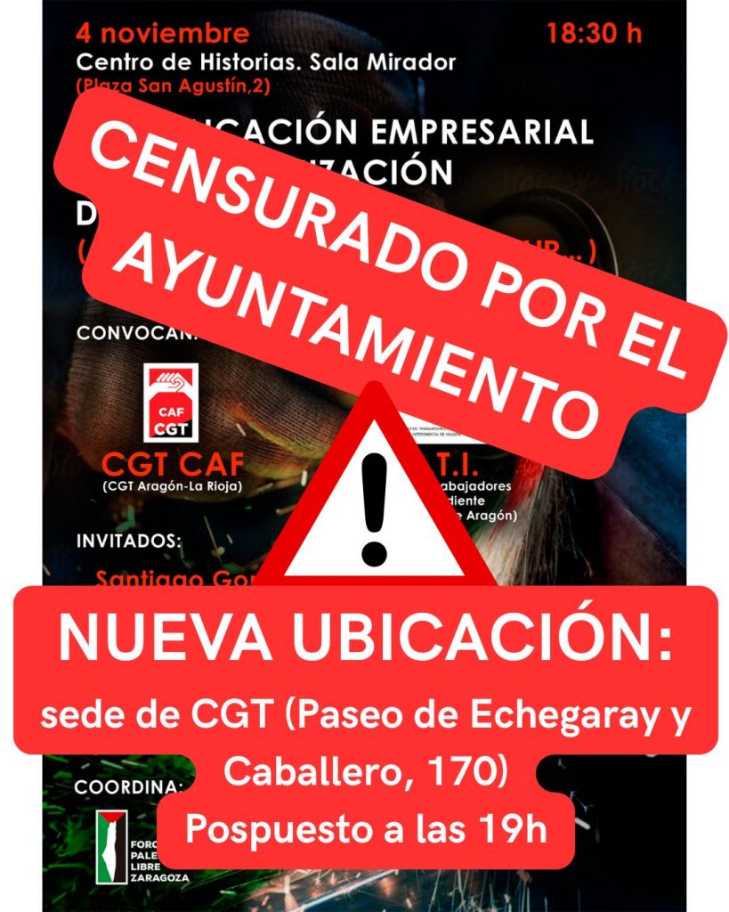 Desde la más absoluta ignorancia cultural e ignominia política, el Ayuntamiento de Zaragoza ha censurado la actividad coordinada por el Foro Palestina Libre de Zaragoza (día 4 de noviembre 18:30 h Centro de Historias) sobre una exposición y posterior debate sobre La Implicación Empresarial en la Colonización de Palestina.