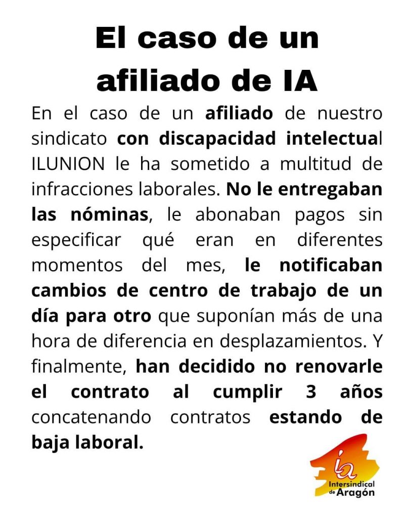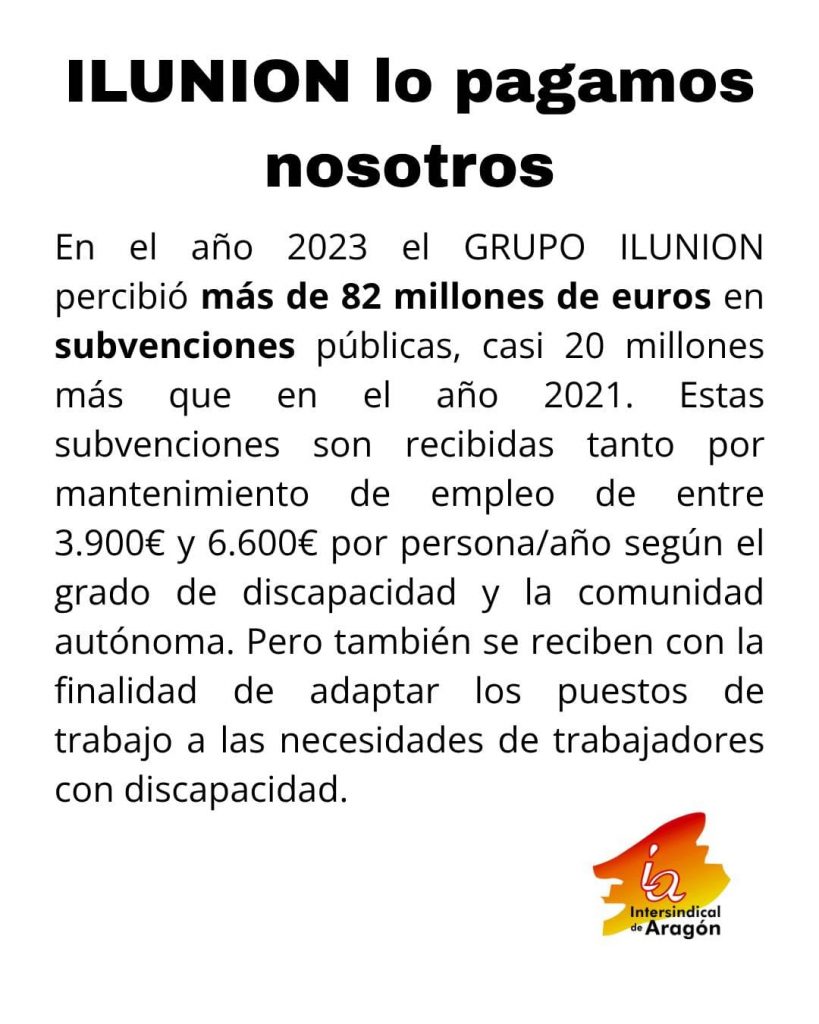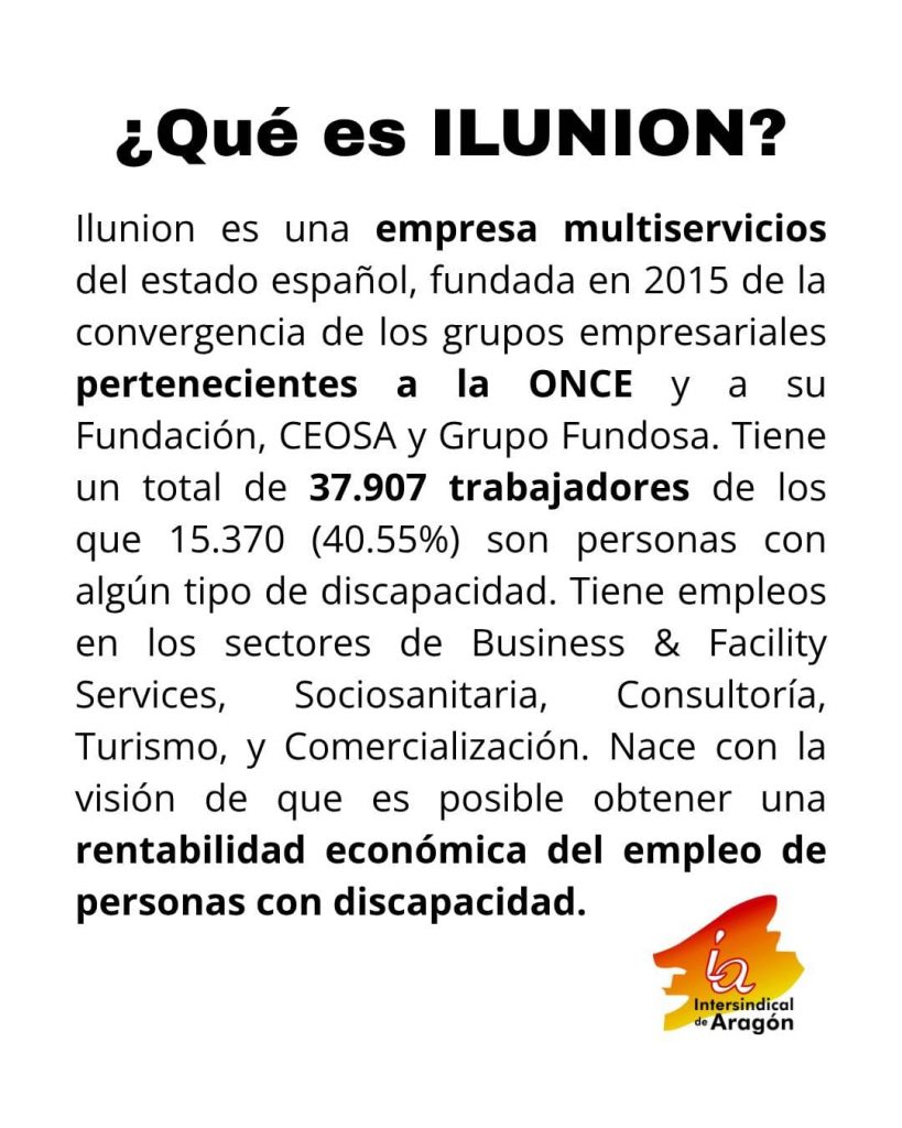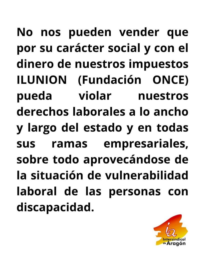 No nos pueden vender que por su carácter social y con el dinero de nuestros impuestos ILUNION (Fundación ONCE) pueda violar nuestros derechos laborales a lo ancho y largo del estado y en todas sus ramas empresariales, sobre todo aprovechándose de la situación de vulnerabilidad laboral de las personas con discapacidad.